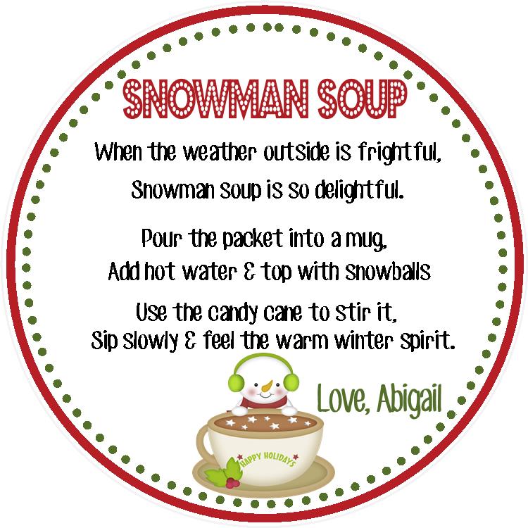 Snowman Soup with Free Printable Recipe Label - Artsy Momma Snowman Soup Label The Poem reads: Was told you've been quite good this year, Always good to hear! With freezing weather drawing near, You'll need to warm the spirit! So here's a little Snowman Soup, Complete with a stirring Stick. Add hot water, sip it slow…. It's sure to do the trick! Printable Snowman Soup Recipe Label Amanda